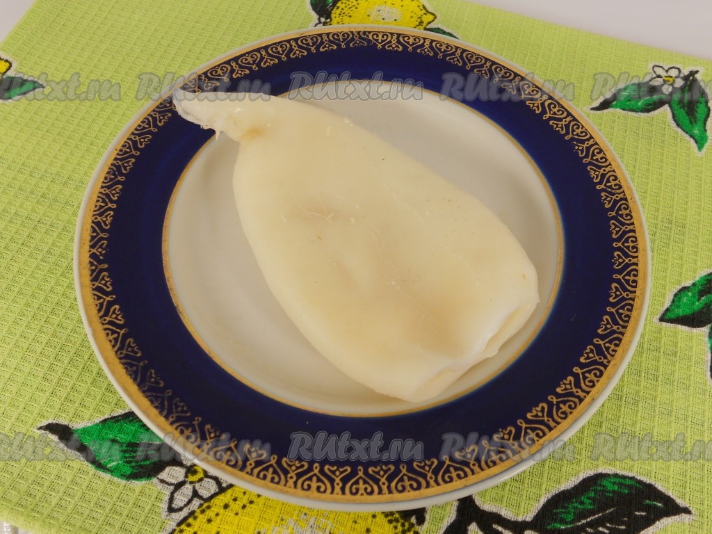 Если кальмары заморожены, их нужно полностью разморозить при комнатной температуре. Если кальмары не очищенные, тогда после размораживания нужно снять с кальмаров тёмную плёночку, покрывающую их сверху, удалить хорду, находящуюся внутри тушки. Кальмары опустить в кипящую подсоленную воду и варить в течение 2 минут (не более). Сразу же поместить их в холодную воду, дать остыть.