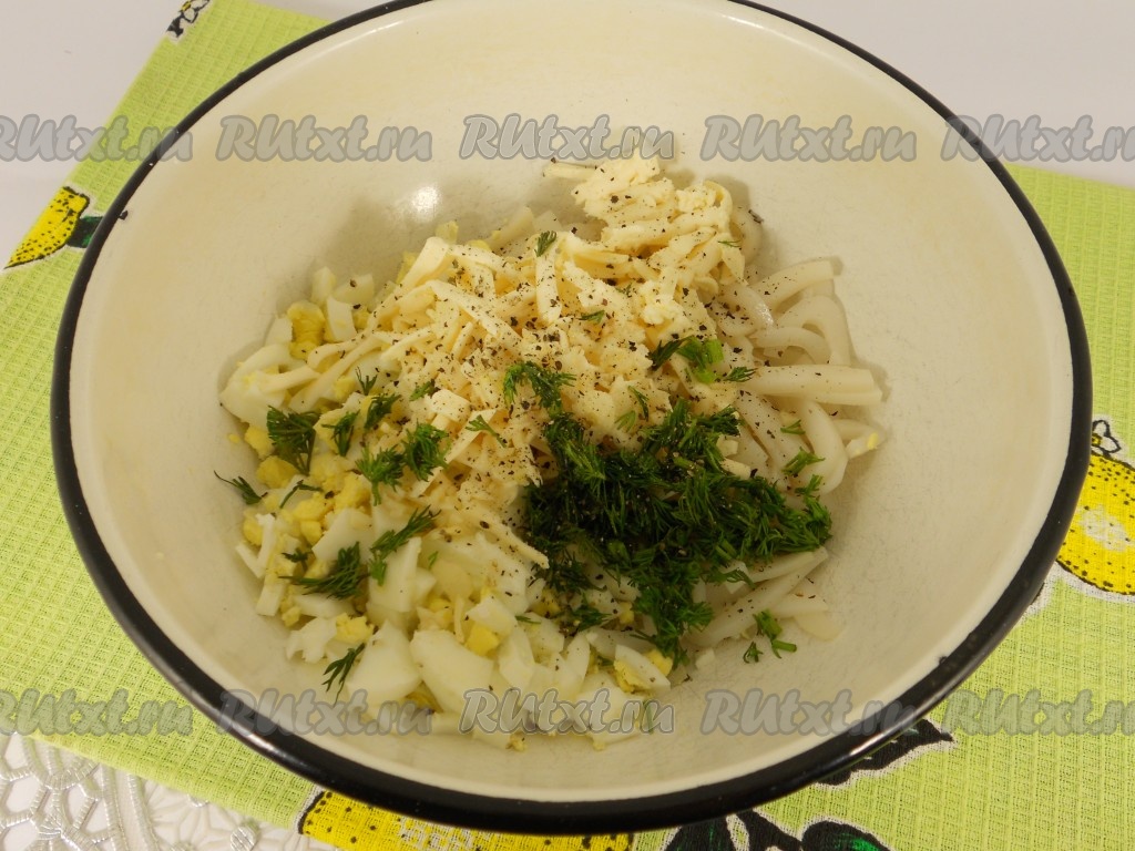 Сюда же выложить мелко нарезанный укроп. Получившийся салат, приготовленный с кальмарами, сыром и чесноком, немного посолить, поперчить.