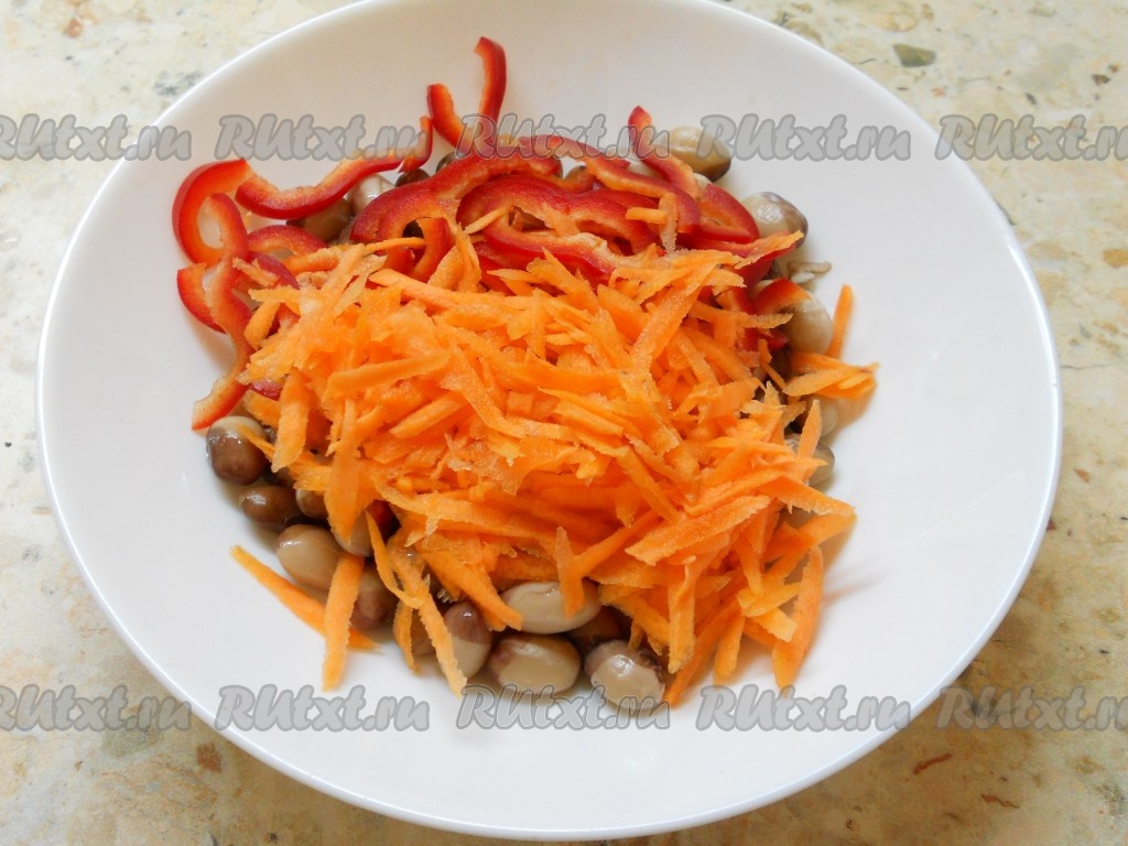 Свежую морковь очистить, натереть на крупной тёрке, добавить в салат из красной фасоли и болгарского перца.
