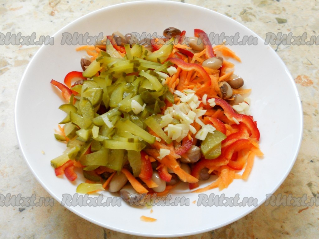 Затем добавить нарезанный соломкой солёный огурец и мелко нарезанный чеснок.