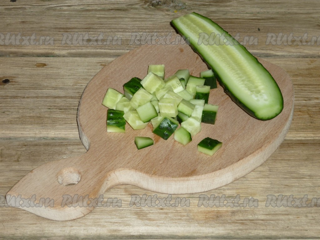 Огурцы нарезать тоже кубиками.