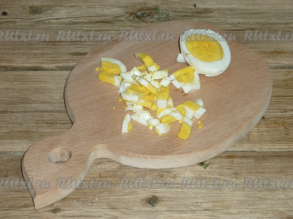 Очищенные яйца тоже нарезать кубиками.