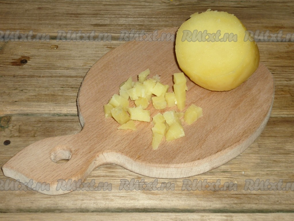 Для начала нужно отварить картофель в мундире. Яйца сварить вкрутую. Вареный картофель очистить и нарезать небольшими кубиками.