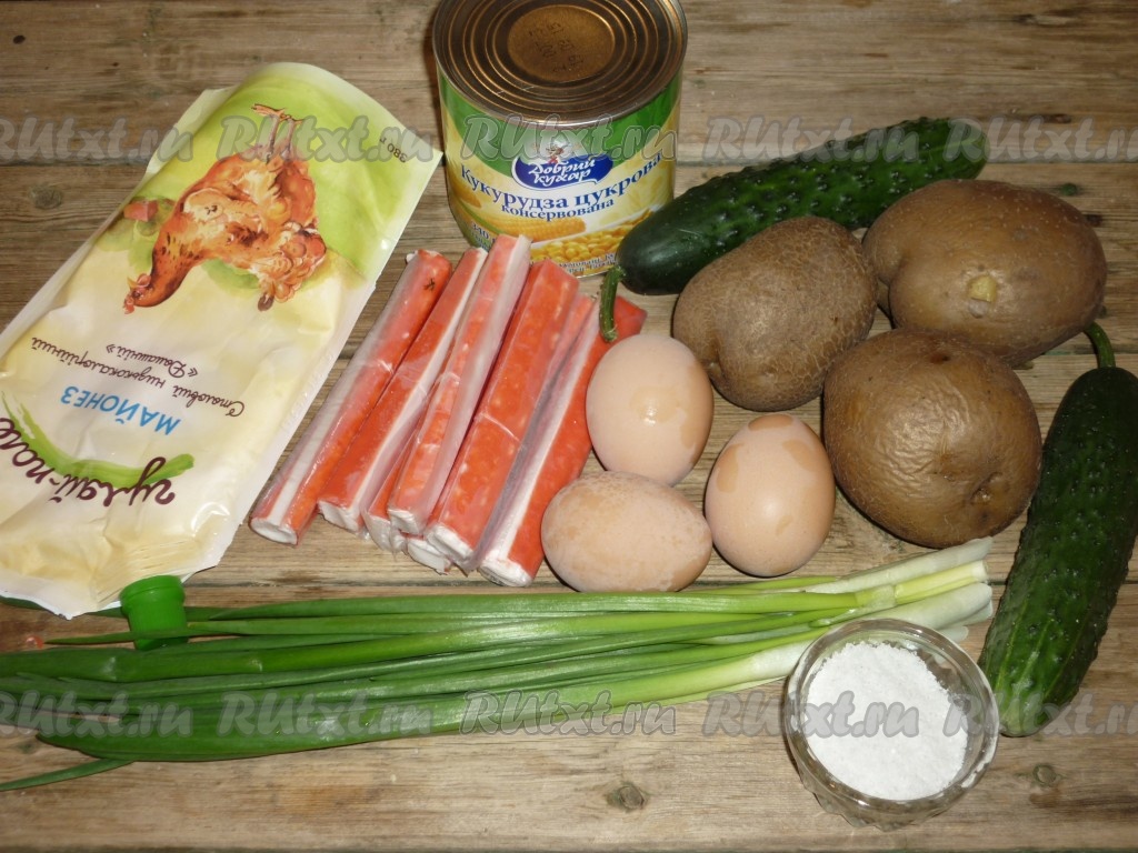 Хочу предложить рецепт вкусного, праздничного крабового салата с картошкой и кукурузой. Приготовление этого блюда не займет у Вас много времени. Порадуйте родных этим простым и вкусным салатиком.