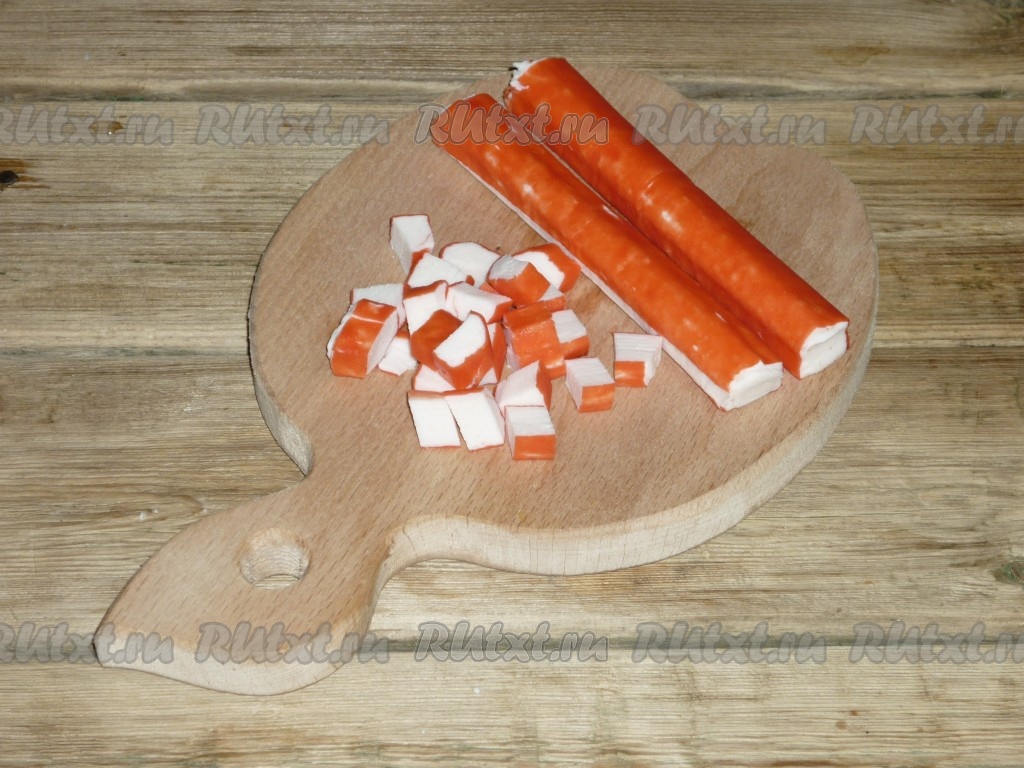 Если крабовые палочки замороженные, разморозить и нарезать кубиками.