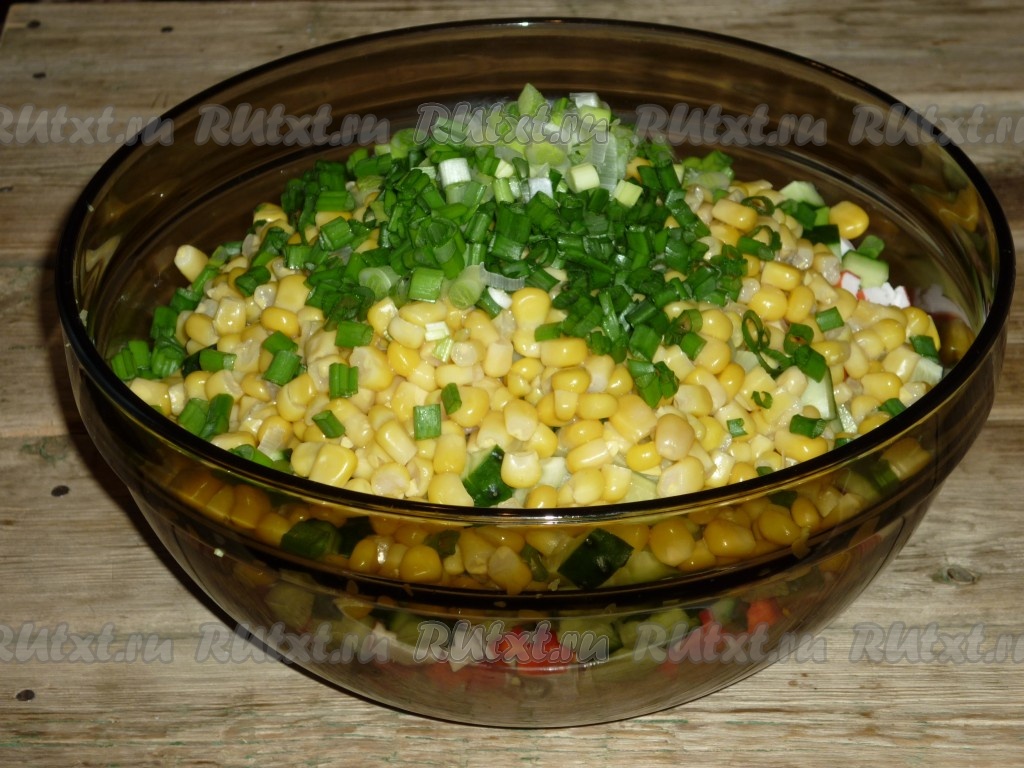 Перед подачей крабовый салат с картошкой и кукурузой охладить, разложить по салатницам и подать на стол.
