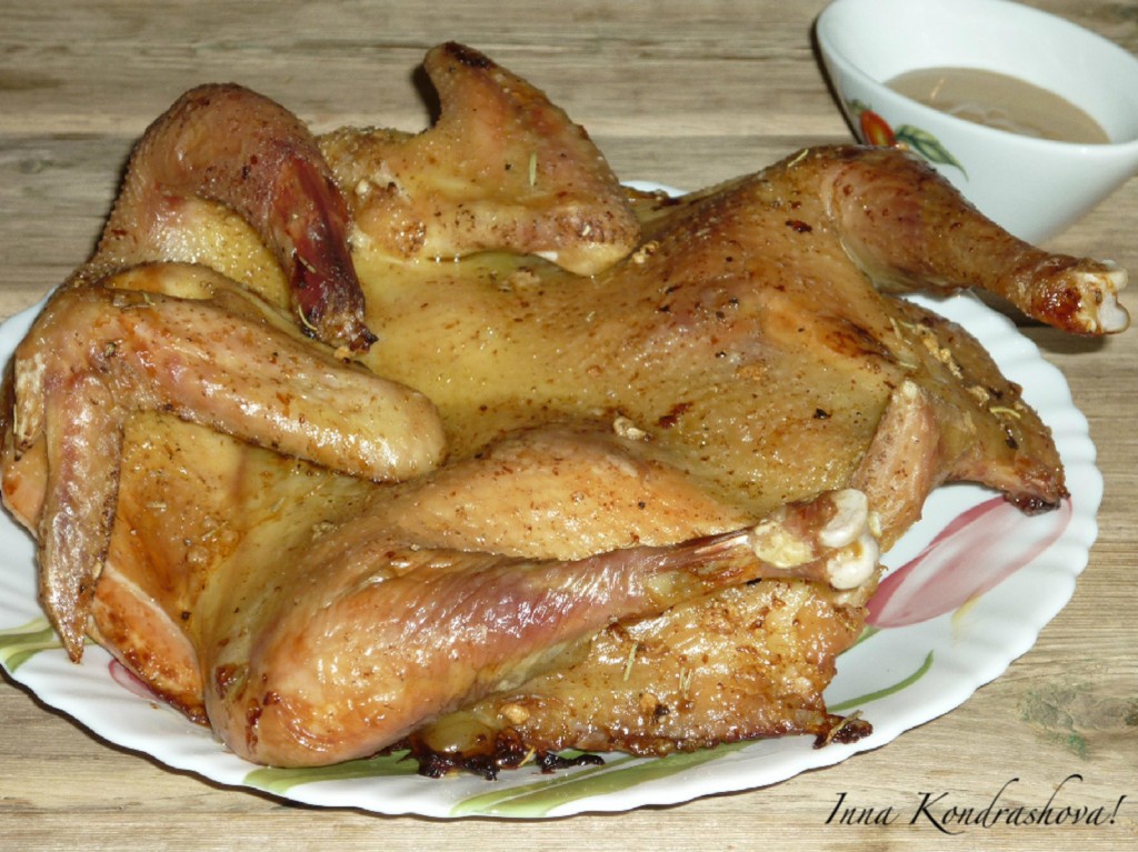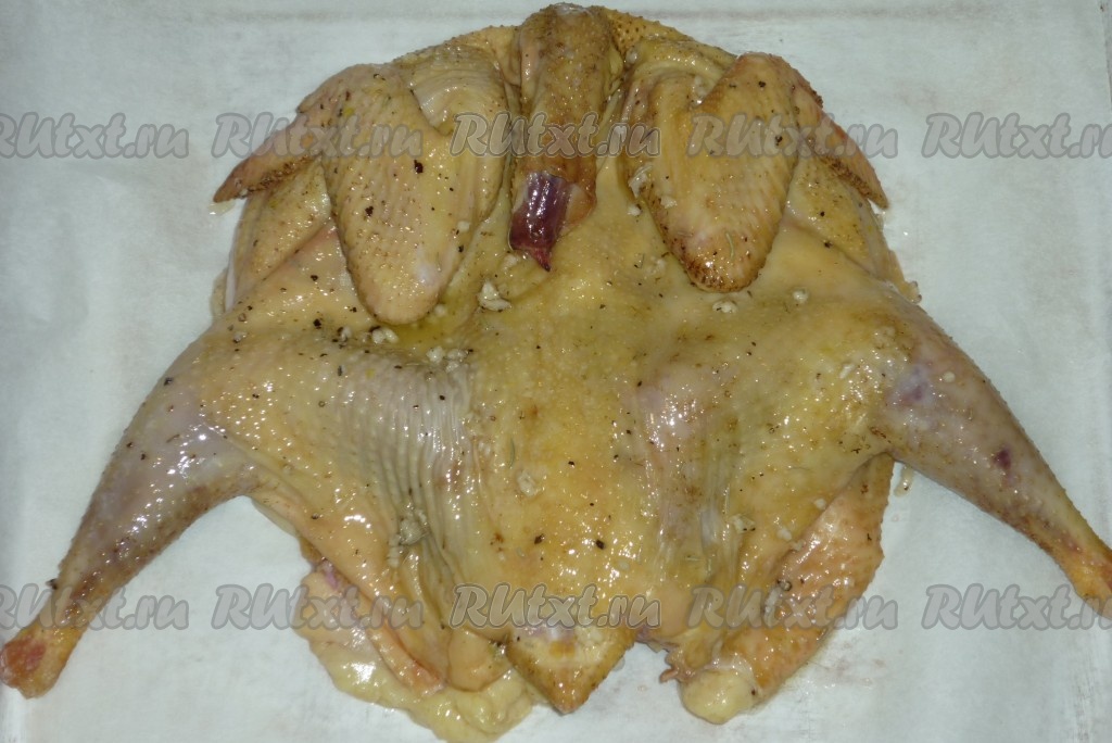 Тушку разрезать вдоль по грудине, а затем, придавливая слегка по хребту, придать курочке более плоскую форму.