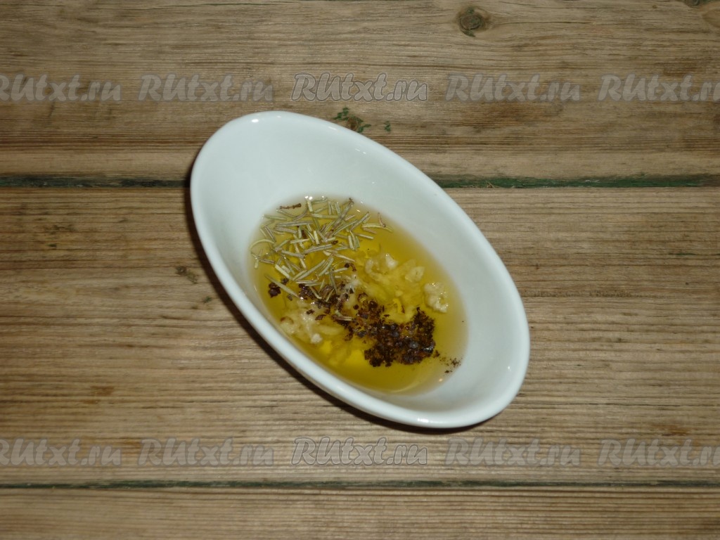 Чеснок очистить, мелко нарезать, переложить в небольшую ёмкость, добавить розмарин, соль, чёрный молотый перец, растительное масло и хорошо перемешать.