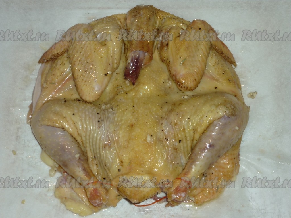 Полученной смесью нужно натереть домашнюю курицу со всех сторон и оставить при комнатной температуре минут на 30-40.