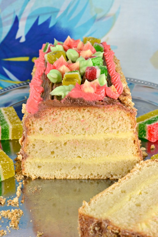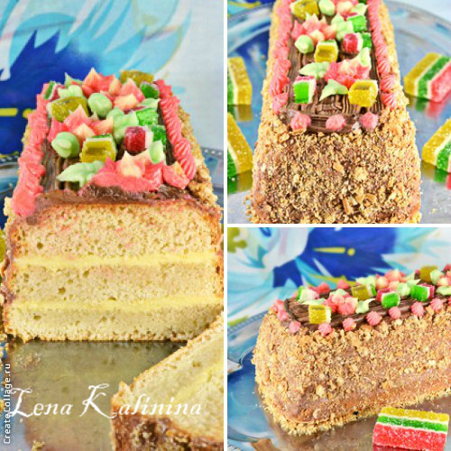 Далее верх торта, по желанию, украсить красным и зелёным кремом в виде цветочков и листочков (каждый крем я отсаживала на торт, предварительно выложив крем в кондитерский мешок с фигурной насадкой), а также цукатами или нарезанными кусочками цветного мармелада.