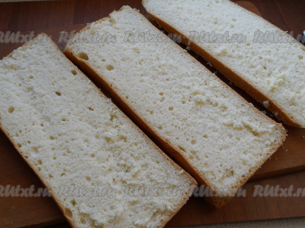Для приготовления сиропа в воду всыпать сахар, довести до кипения и остудить. Бисквит разрезать вдоль на 3 части.