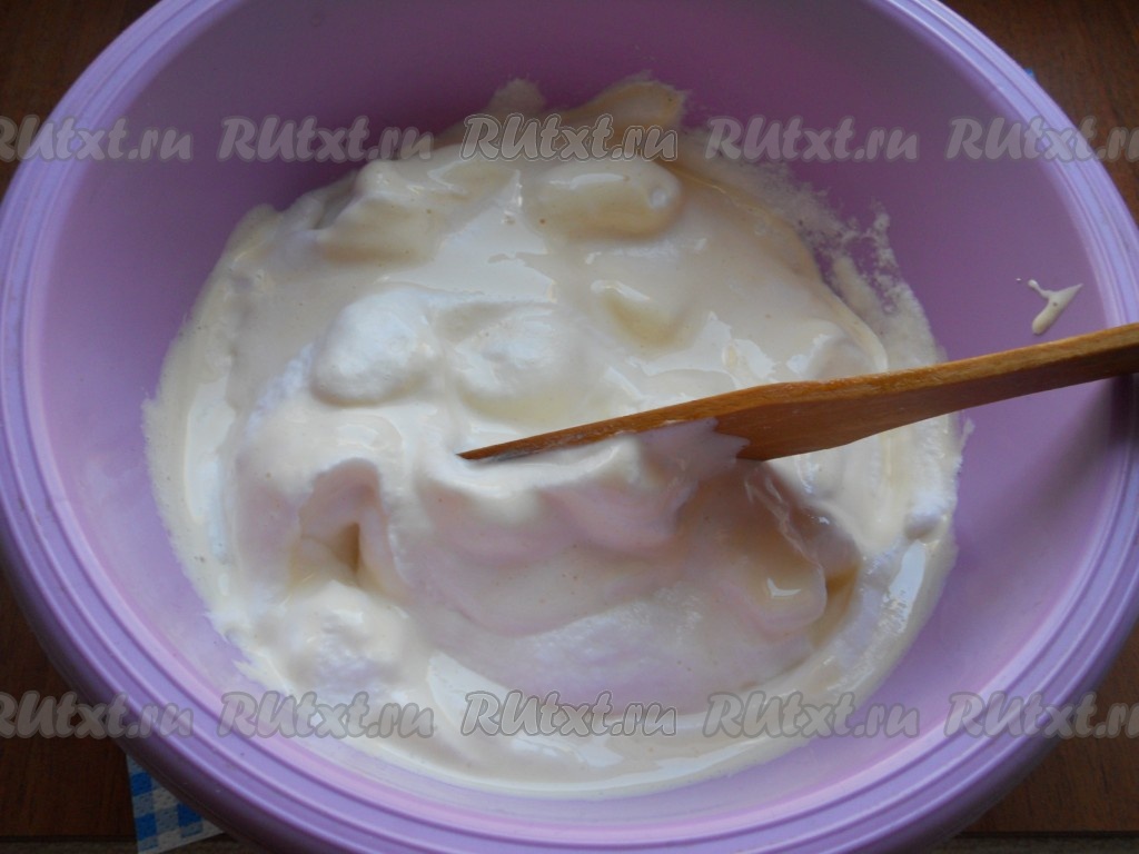 В миске соединить взбитые белки со взбитыми желтками, аккуратно перемешать деревянной лопаткой.