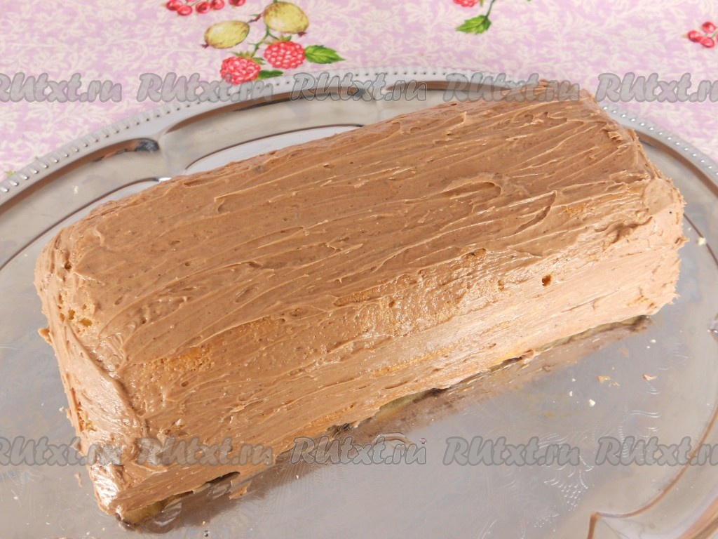Сверху накрыть верхней частью бисквита. Смазать верх и бока кремом с какао-порошком.