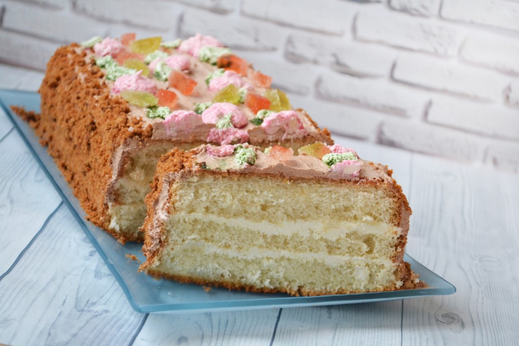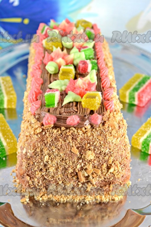 Бока торта "Сказка" обсыпать измельчённой крошкой от бисквита.