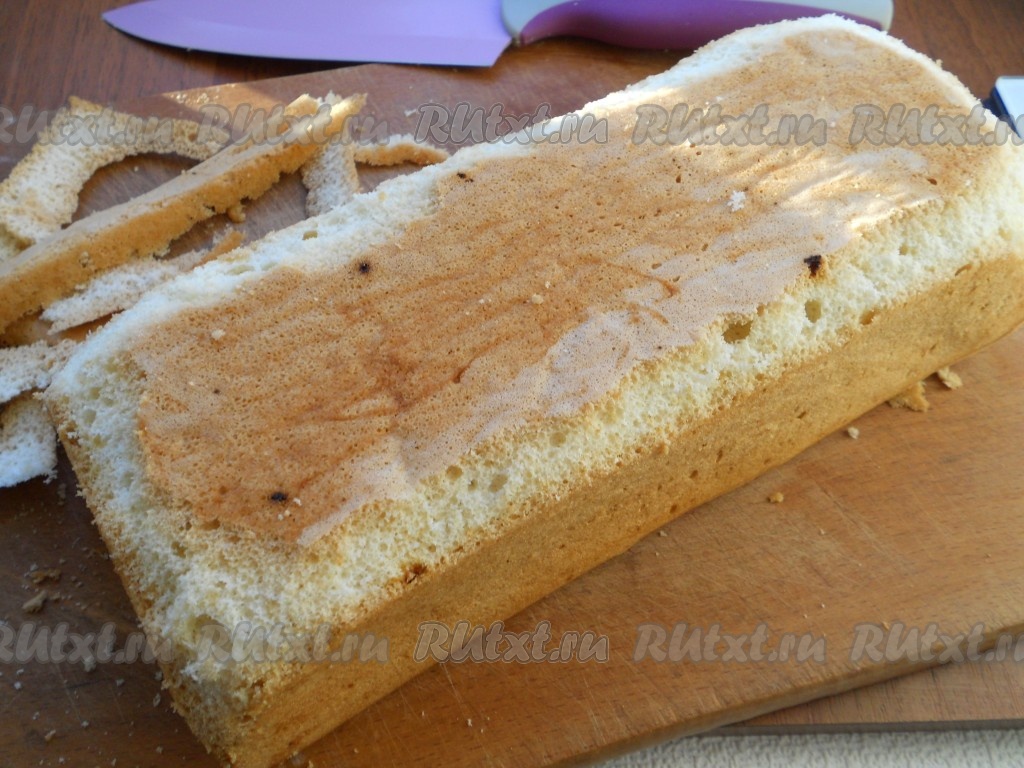 Острые углы и боковые верхние части бисквита обрезать острым ножом, как бы закругляя края. Обрезки подсушить (я подсушила в микроволновке, можно подсушить в духовке) и измельчить.