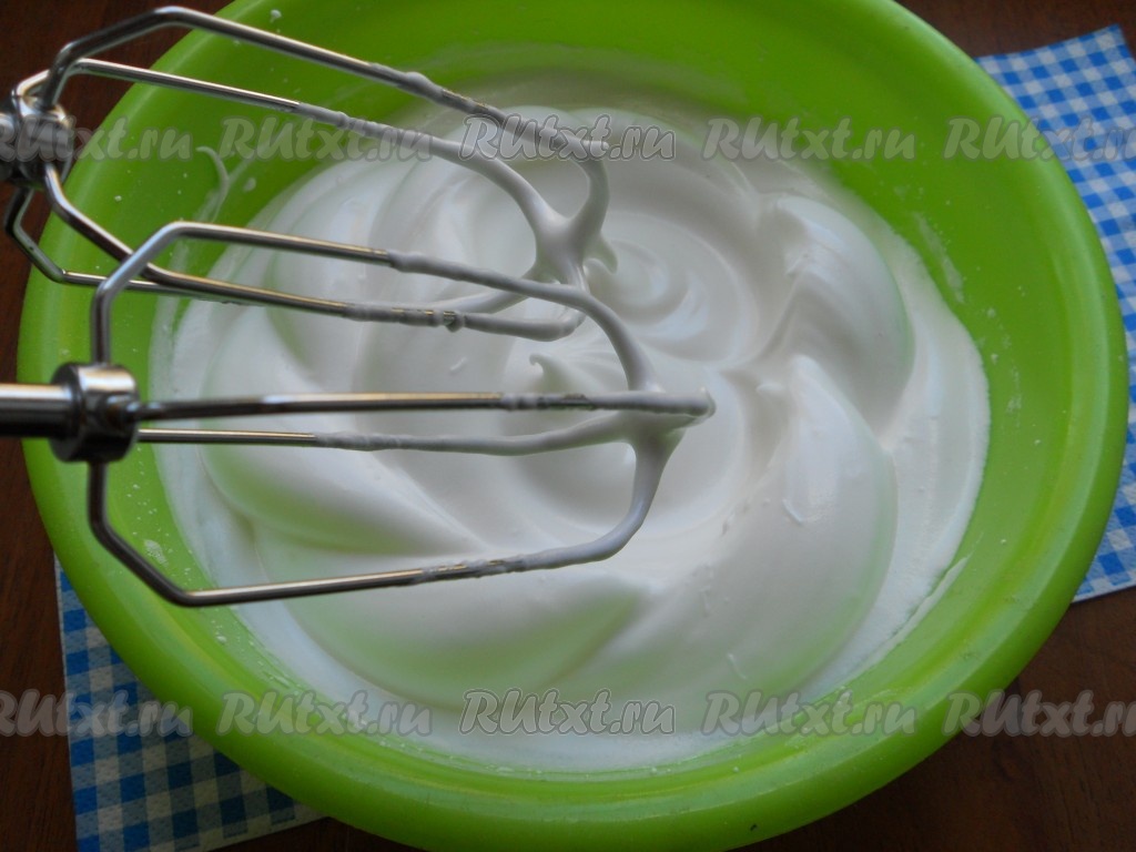 Прежде всего нужно испечь бисквит и он должен отлежаться хотя бы 8 часов. Для приготовления бисквита яйца из холодильника нужно аккуратно разделить на белки и желтки. Охлаждённые белки нужно выложить в объёмную миску, взбить миксером до пены. Не переставая взбивать, частями всыпать 60 грамм сахара и продолжать взбивать до крепких пиков (примерно 5-6 минут).