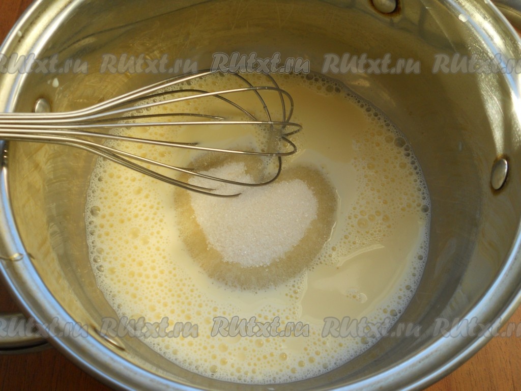 Всыпать сахар, перемешать венчиком и поместить кастрюлю на средний огонь.