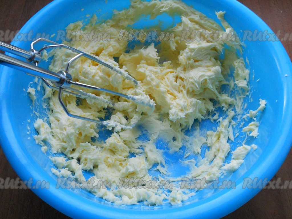 Масло взбить миксером с ванильным сахаром до кремообразного состояния.