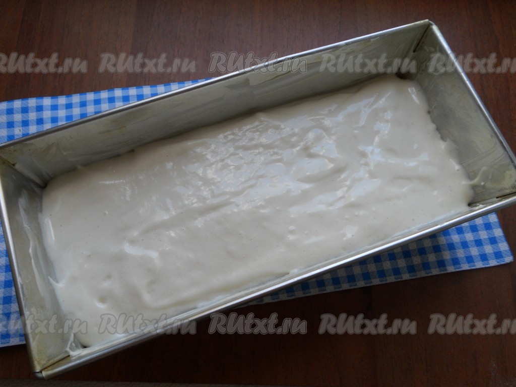 Продолговатую форму для кекса (у меня форма размером 12х25 сантиметров) смазать сливочным маслом, на дно поместить пергамент. Выложить подготовленное тесто, разровнять.