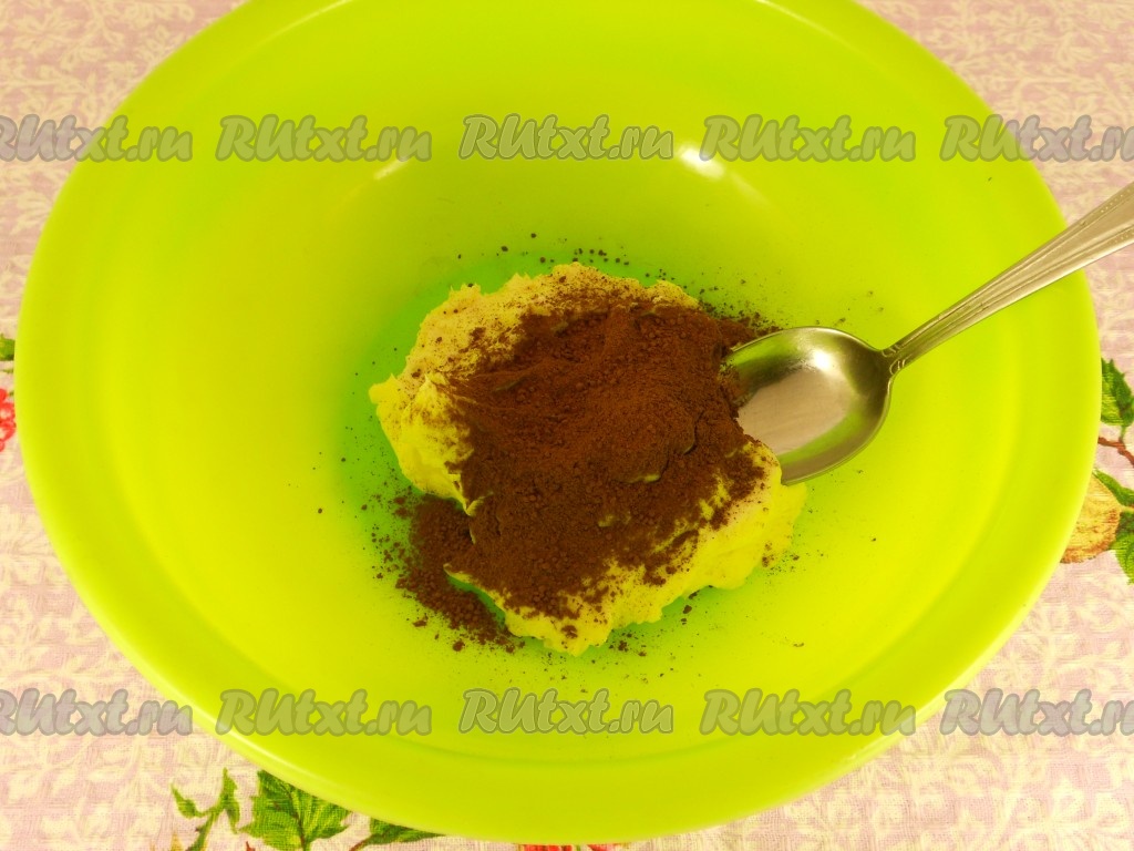 Отложить 1/3 часть крема, всыпать в него просеянный какао-порошок, перемешать столовой ложкой до однородности. По желанию, отложите от оставшегося крема ещё 2 столовых ложки крема в разные ёмкости. К одной столовой ложке крема добавьте немного красного пищевого красителя, к другой - зелёный пищевой краситель. Перемешайте. Получившиеся красный и зелёный крема будем использовать для украшения торта "Сказка".