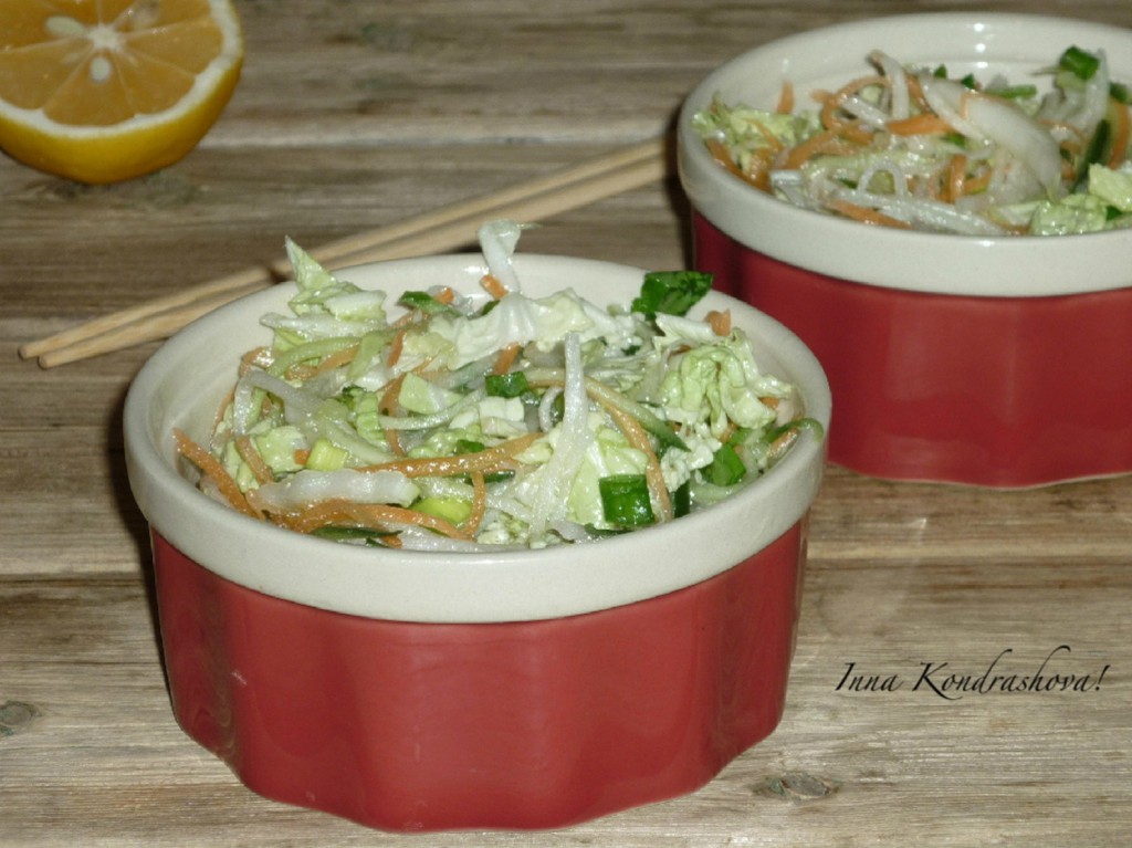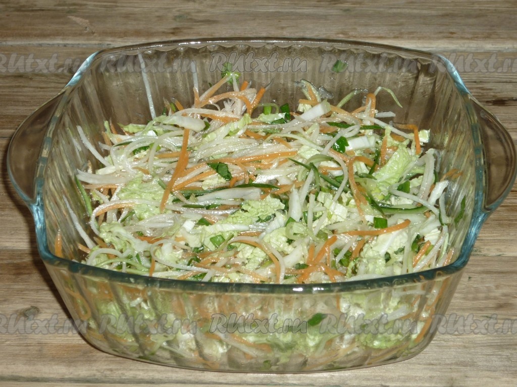 Салат из пекинской капусты с дайконом получается вкусным, хрустящим и станет отличным дополнением ко многим блюдам.