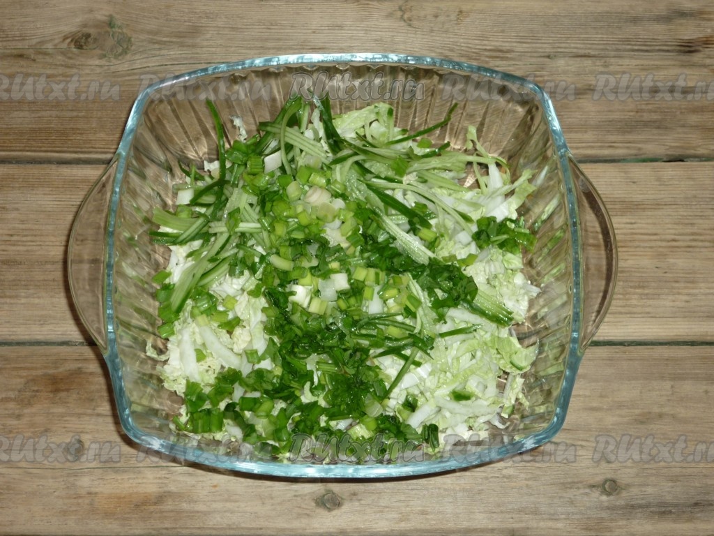Мелко нарезанные лук и зелень добавить в салат с пекинской капустой, дайконом, морковью и огурцом, посолить и перемешать.