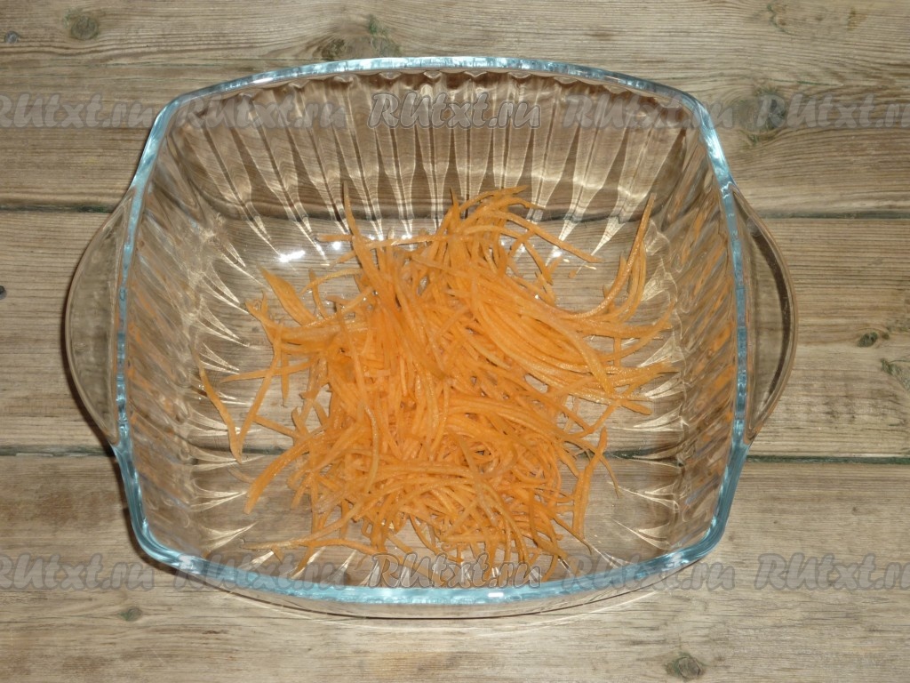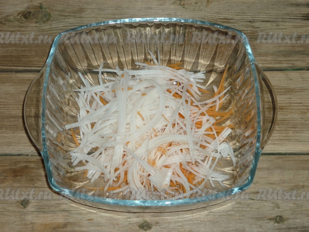 Дайкон очистить и натереть таким же способом, как и морковь.