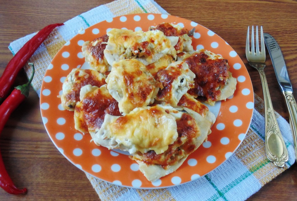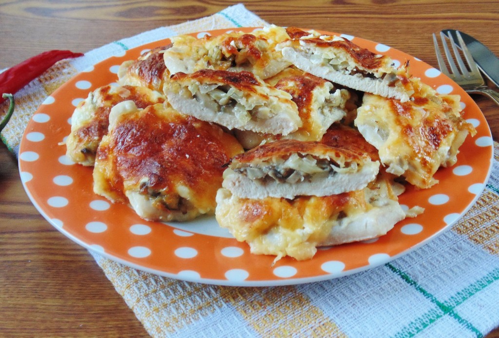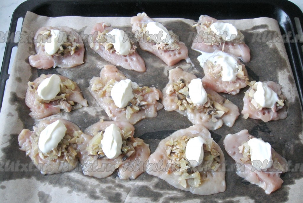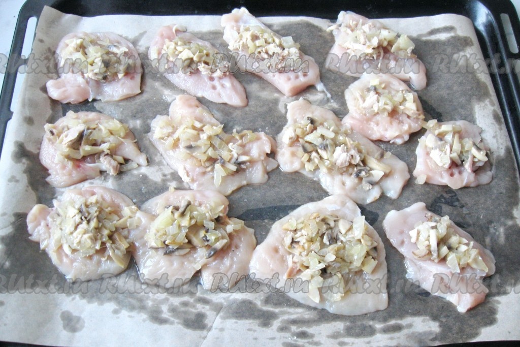 На каждый кусочек куриного филе выложить смесь грибов с луком.