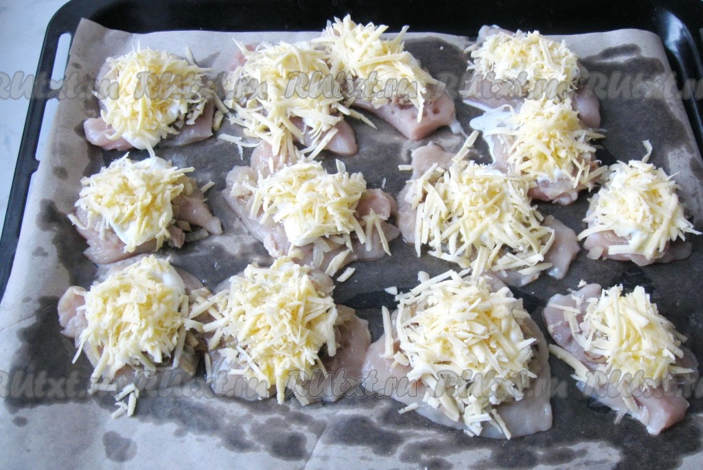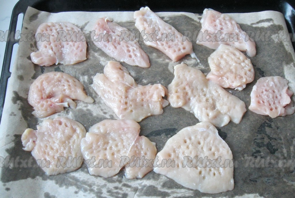 Филе куриной грудки помыть и нарезать небольшими кусочками, приблизительно 6х5 сантиметров. Немного отбить, выложить на противень с пекарской бумагой и посолить.