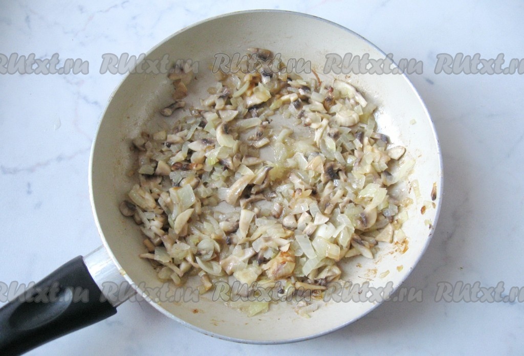 Шампиньоны и репчатый лук почистить, помыть и мелко нарезать. Выложить на сковороду и налить подсолнечное масло.