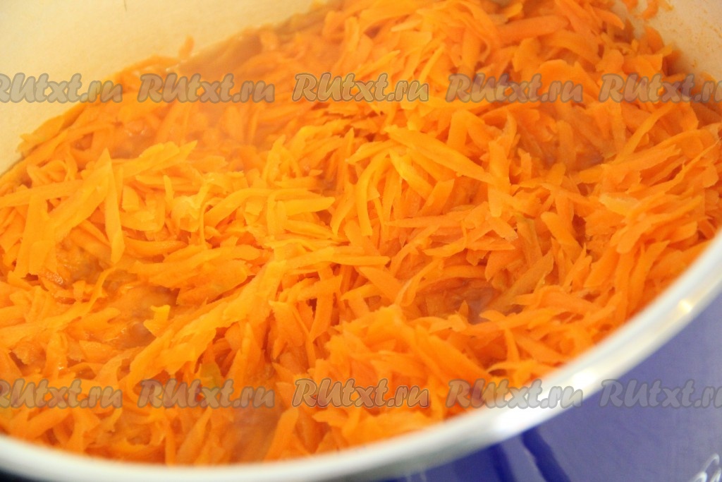 Морковь почистить и натереть на крупной тёрке. В глубокую кастрюлю влить воду и добавить морковь. Поставить кастрюлю на огонь.