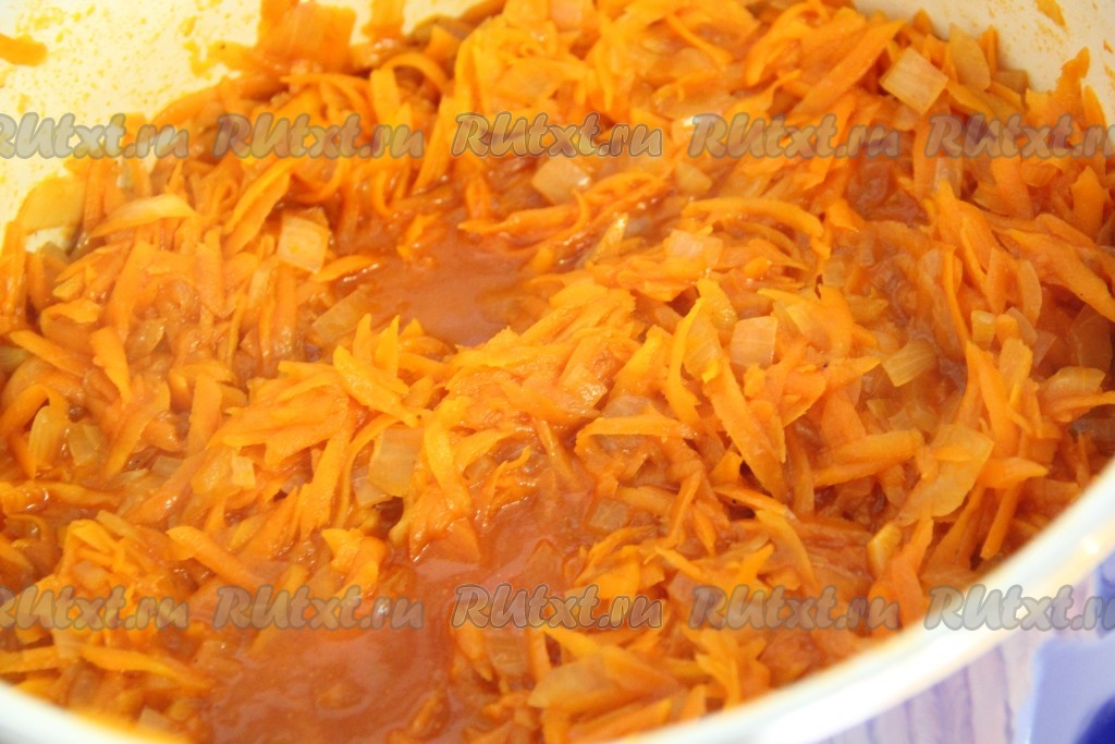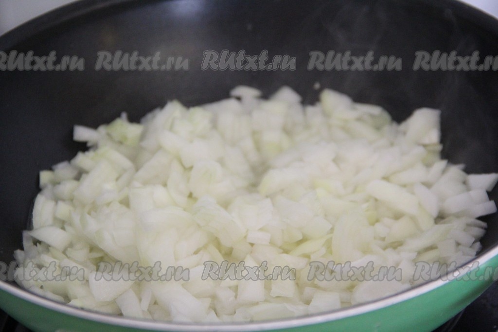 Лук обжарить до лёгкого золотистого цвета, периодически помешивать.
