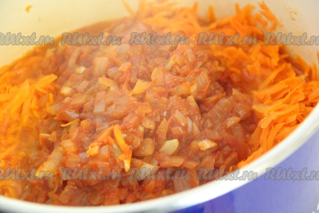 Как только морковь закипит, добавить в кастрюлю лук с томатом. Лавровый лист убрать!