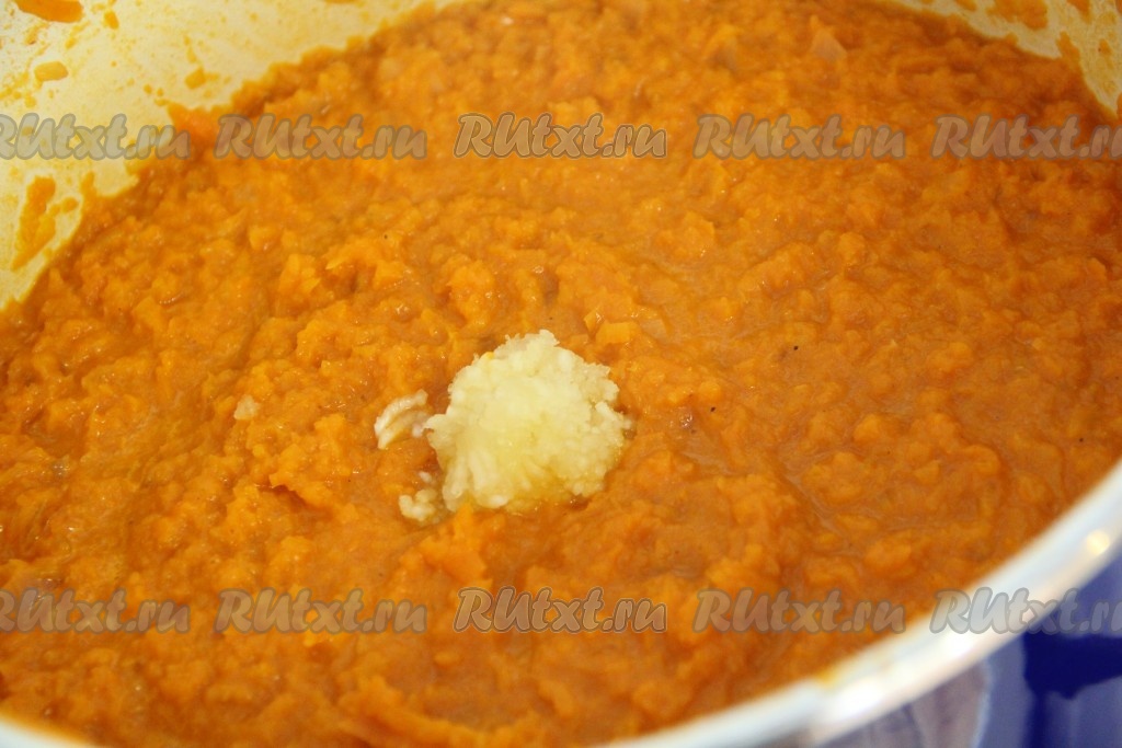 Чеснок почистить и пропустить через пресс. Кастрюлю с морковной икрой поставить на огонь, добавить измельчённый чеснок и влить уксус. Всё тщательно перемешать, довести овощную смесь до кипения и снять с огня.