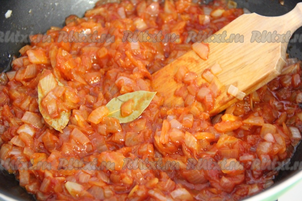 Хорошо перемешать лук с томатной пастой, добавить лавровый лист. Тушить лук с томатной пастой на среднем огне 5-7 минут, иногда помешивая.