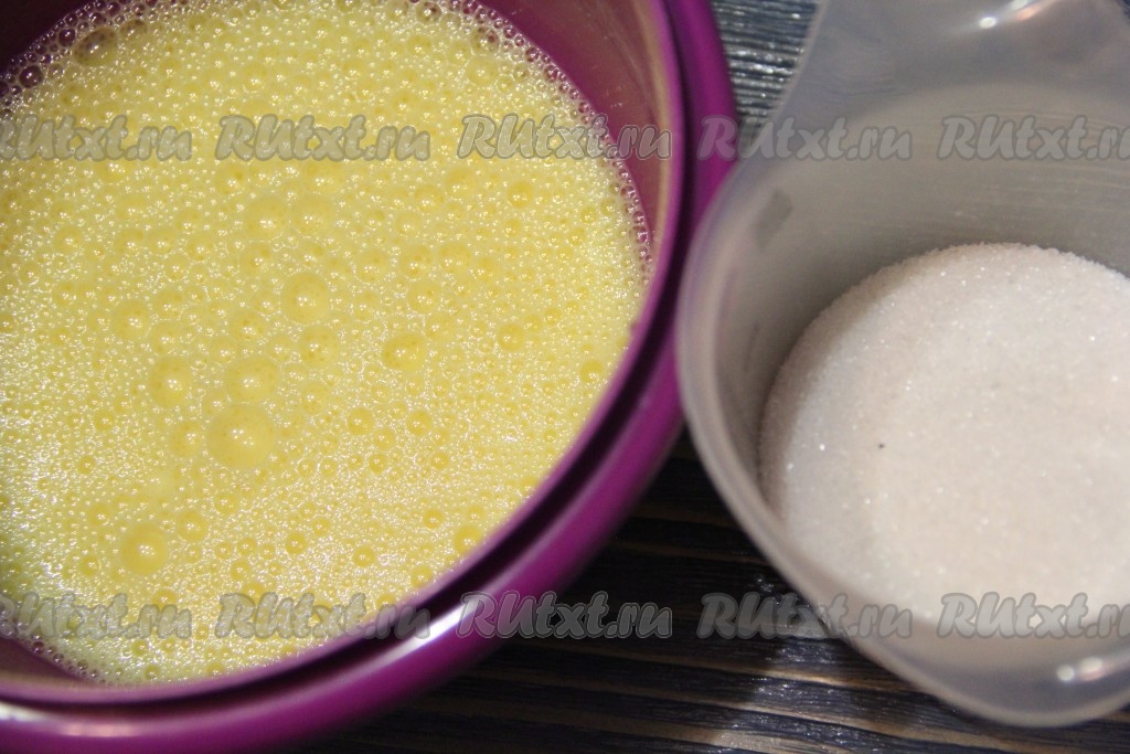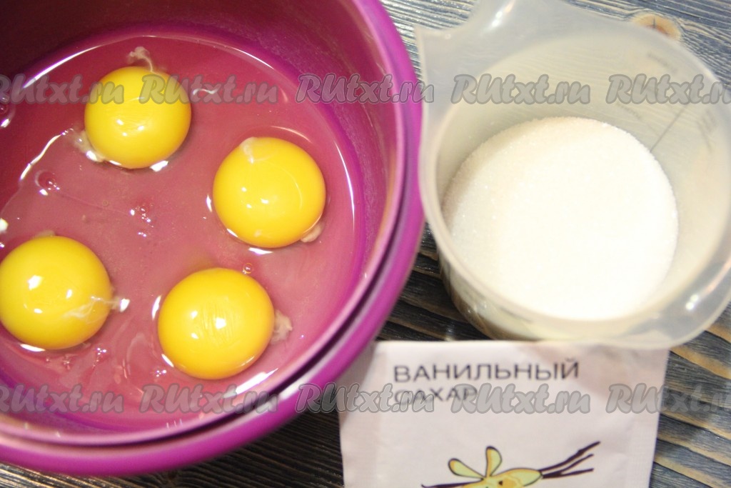Затем всыпать сахар, ванильный сахар и влить сгущёнку. Взбивать массу на высокой скорости в течение 5 минут. Масса должна посветлеть и увеличиться в объёме.