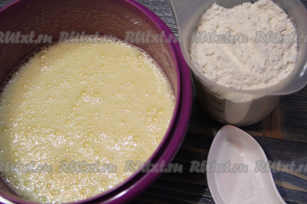 Всыпать в яичную массу просеянную муку и разрыхлитель. На низкой скорости миксера перемешать муку с яичной массой до однородного состояния.