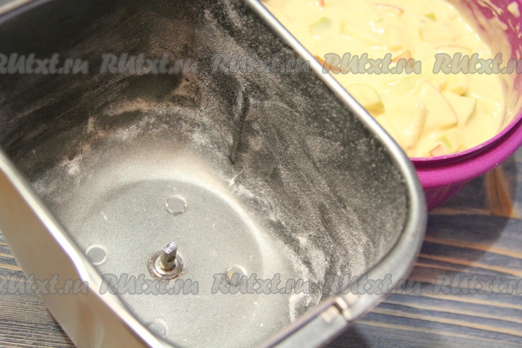 Выложить тесто с яблоками в ведёрко и поставить в хлебопечь. Выставить режим "Выпечка", время на таймере - 80 минут.