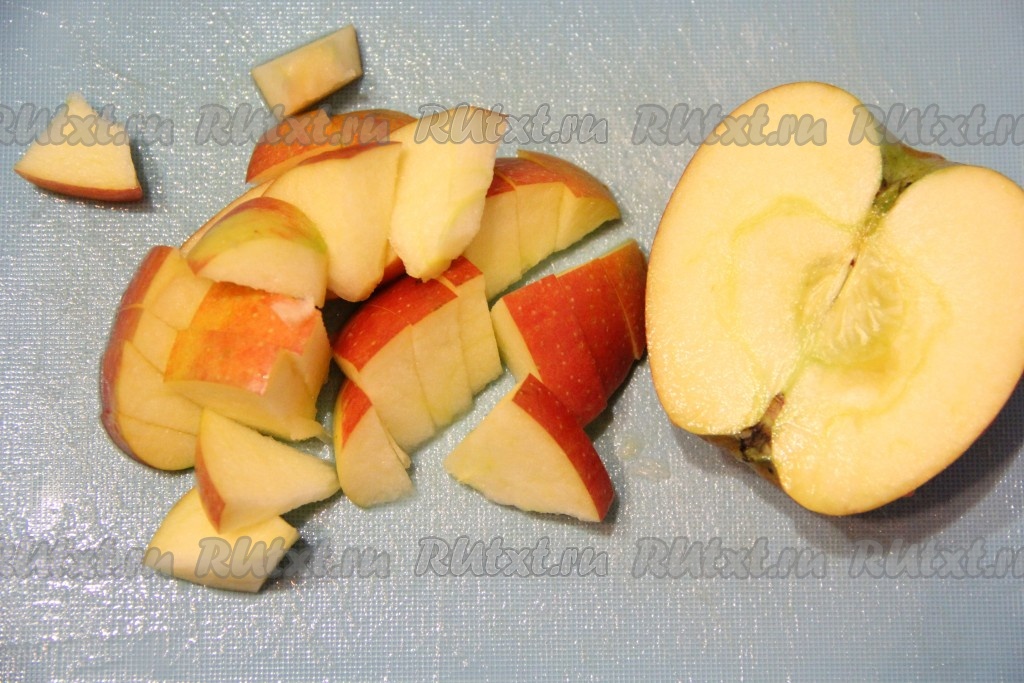 Яблочки лучше нарезать в первую очередь, так как тесто готовится за считанные минуты и, чтобы оно не осело, яблоки должны быть готовы.