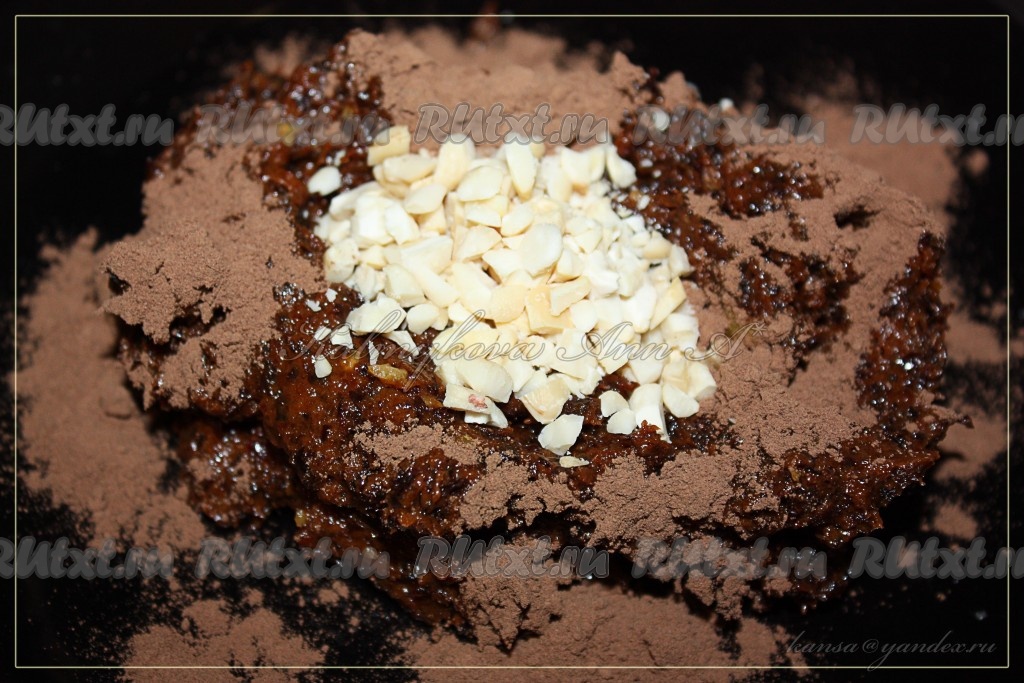 В пюре из чернослива добавить какао и орехи, тщательно перемешать.