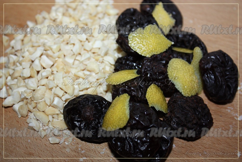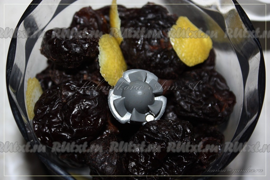 Залить чернослив кипятком и оставить минут 10, затем воду слить. Чернослив обсушить. С лимона снять цедру (я срезала цедру пластинками, а потом измельчала её вместе с черносливом). Орехи измельчить.