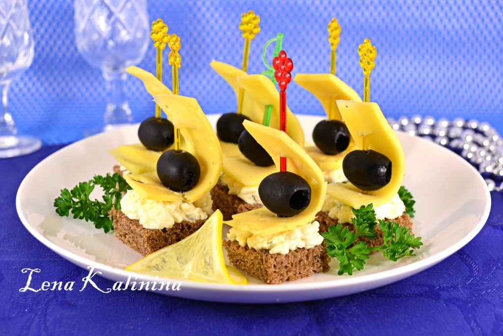 Шпажками зафиксировать пластинки сыра с двух сторон, между ними разместить оливки. Шпажки с сыром и оливками воткнуть в подготовленные канапе из черного хлеба и плавленного сыра. Украсить замечательные, вкусные канапе с оливками и сыром зеленью, кружочками лимона и подать на стол.