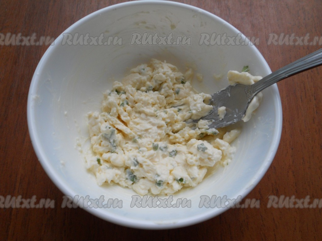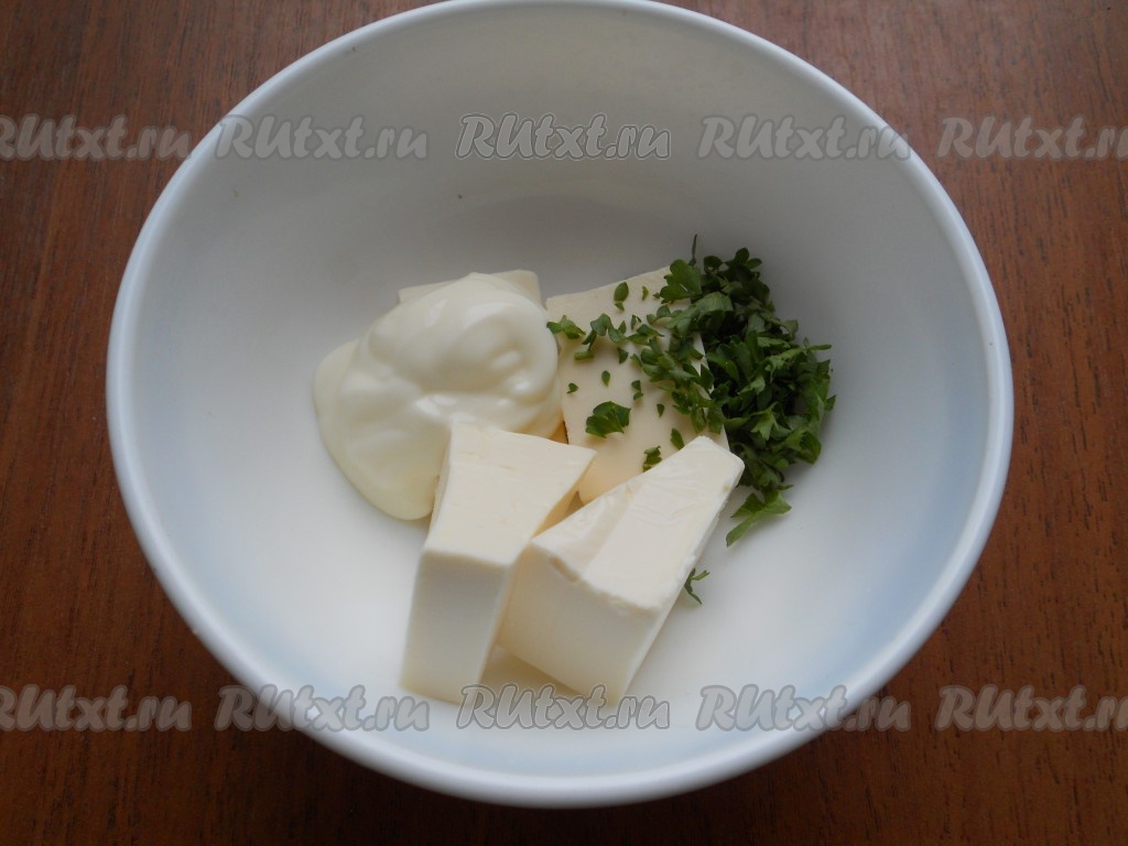 К плавленному сыру добавить майонез и измельченную зелень (укроп, петрушку).