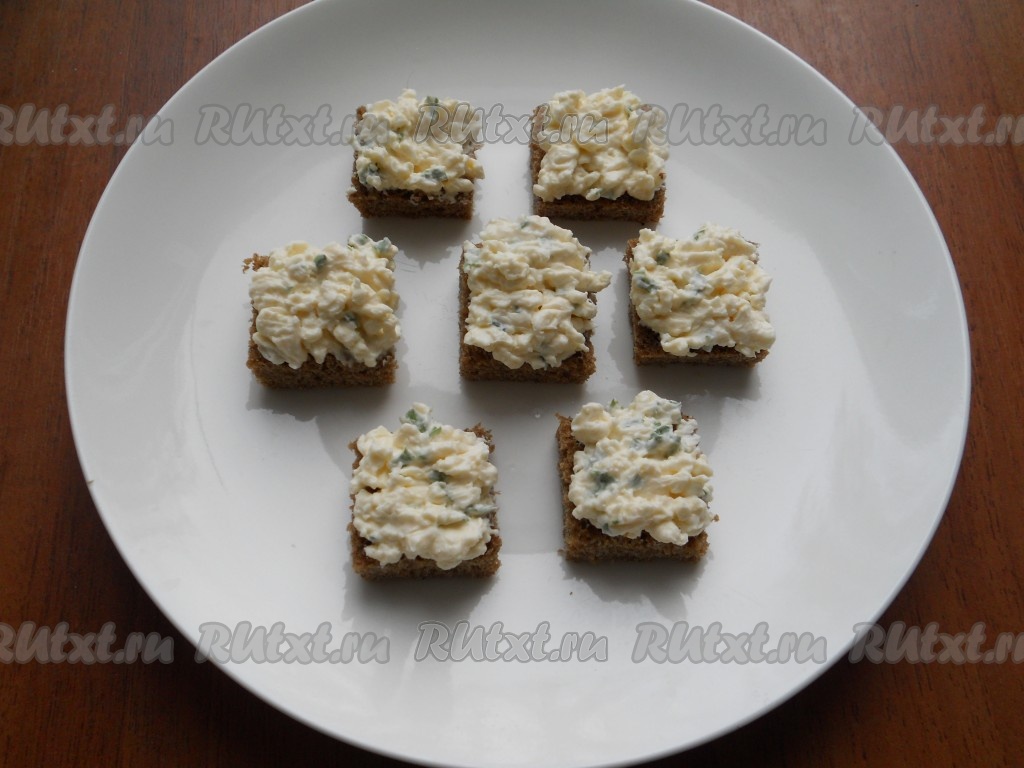 Ржаной хлеб нарезать на ломти толщиной не более 1 см. Обрезав корочки, разрезать хлеб на небольшие квадратики, поместить их на блюдо.