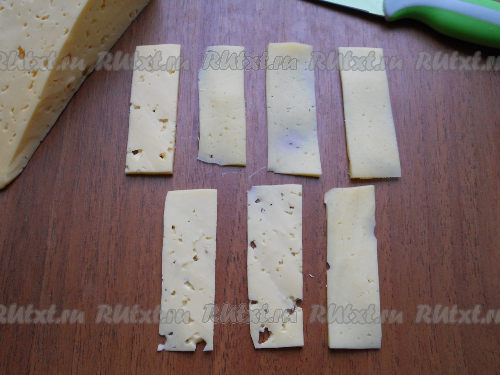 Твердый сыр нарезать тоненькими пластинами, размером примерно 7 см на 2,5 см.
