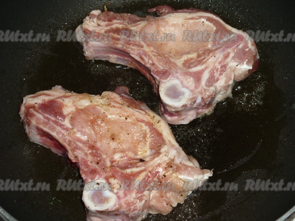 На сковороду влить 2-3 столовых ложки растительного масла и хорошо разогреть. Выложить свиные котлеты на кости на сковороду.