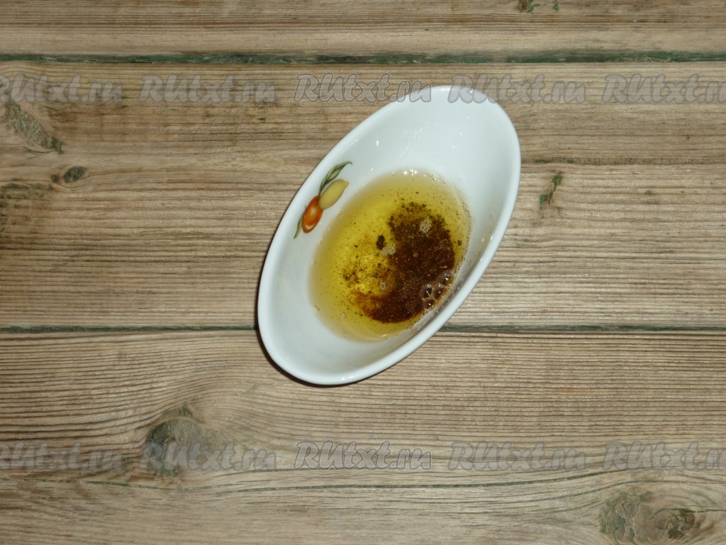 Соль и специи для мяса перемешать в одной мисочке, в полученную смесь добавить растительное масло. В качестве специй я взяла 0,5 чайной ложки чёрного молотого перца и 1 чайную ложку молотой паприки.