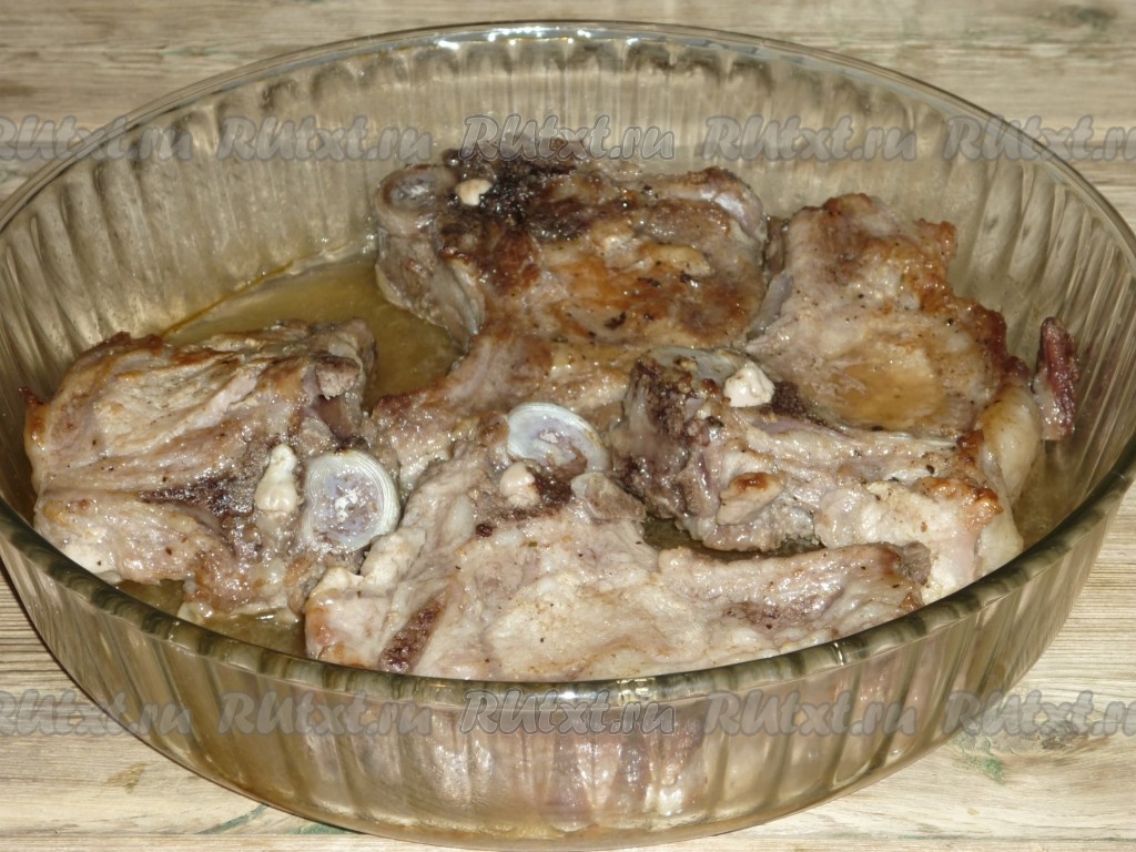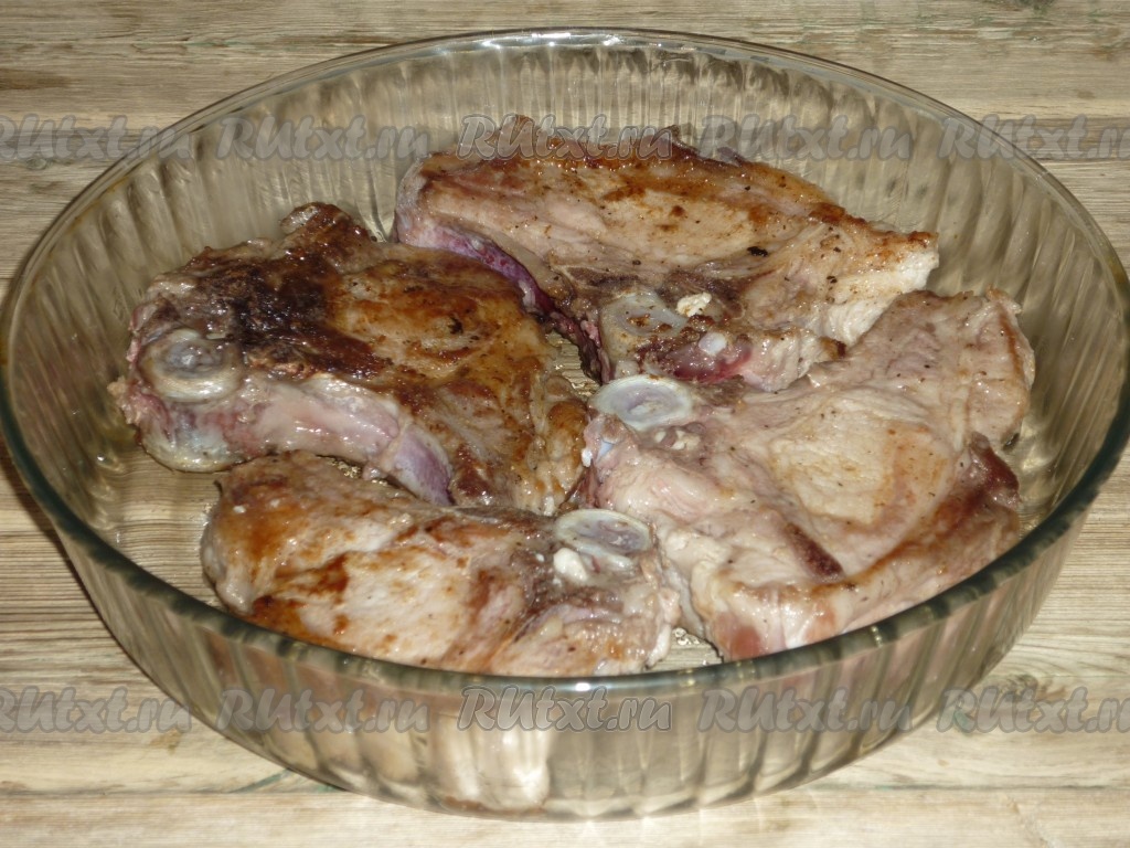 Выложить поджаренные котлеты на кости в жаропрочную форму, добавить со сковороды сок, который выделился при их обжаривании.