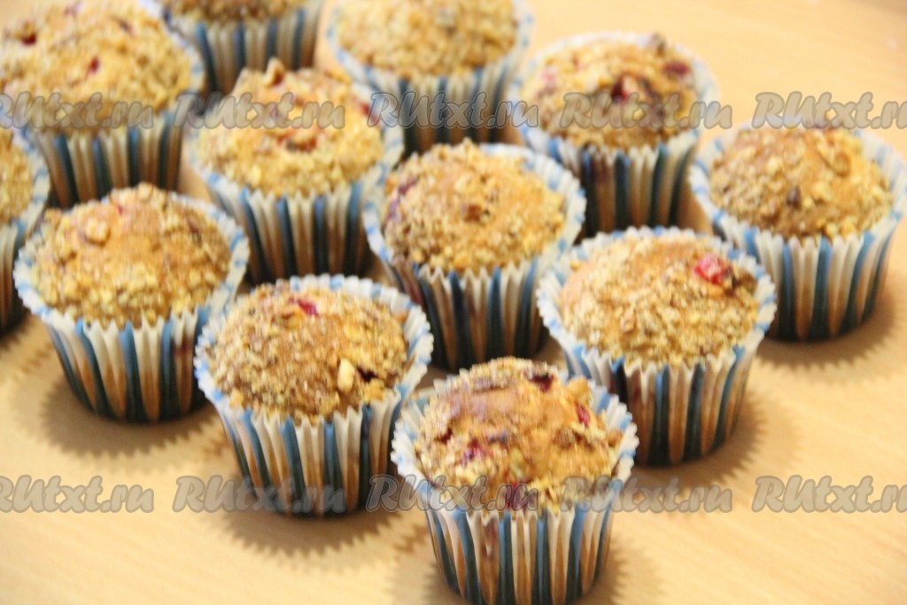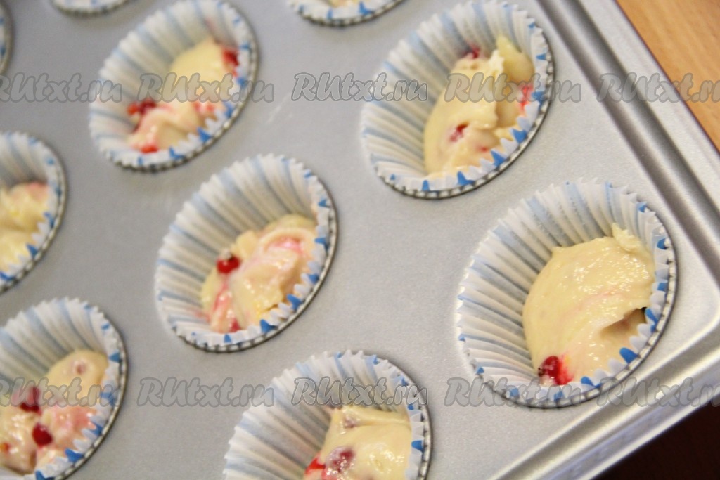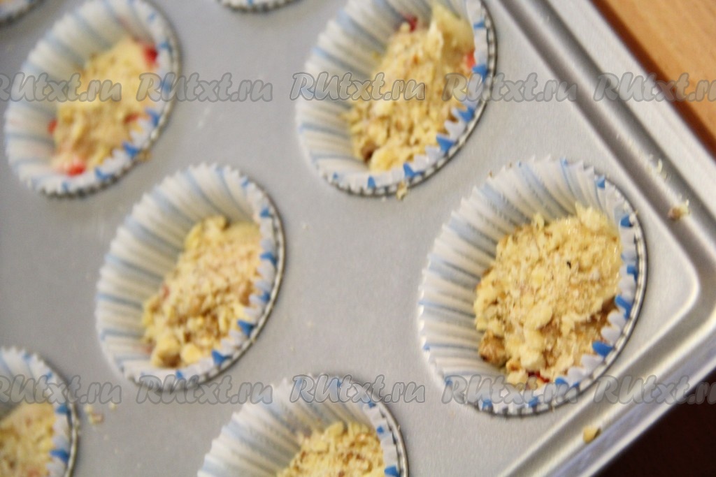 Я использовала бумажные вкладыши для выпечки кексиков, вложив их в форму для выпечки. Кексы я выпекала с ореховой посыпкой, поэтому формочки заполняла тестом на 1/3 объёма. Если вы будете готовить без ореховой посыпки, тогда заполняйте формочки на 2/3 объёма.