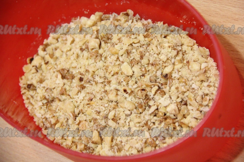 Посыпать верх теста ореховой посыпкой.